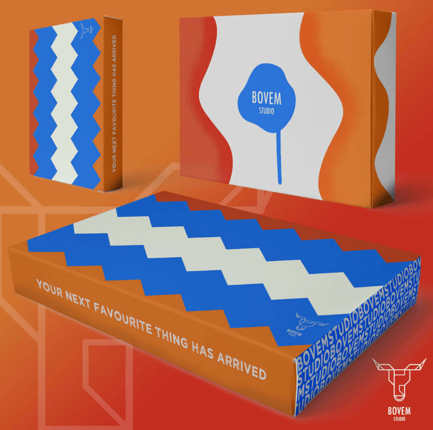 Packaging design for Bovem Studio box where merchandise and other items would ship to clients.